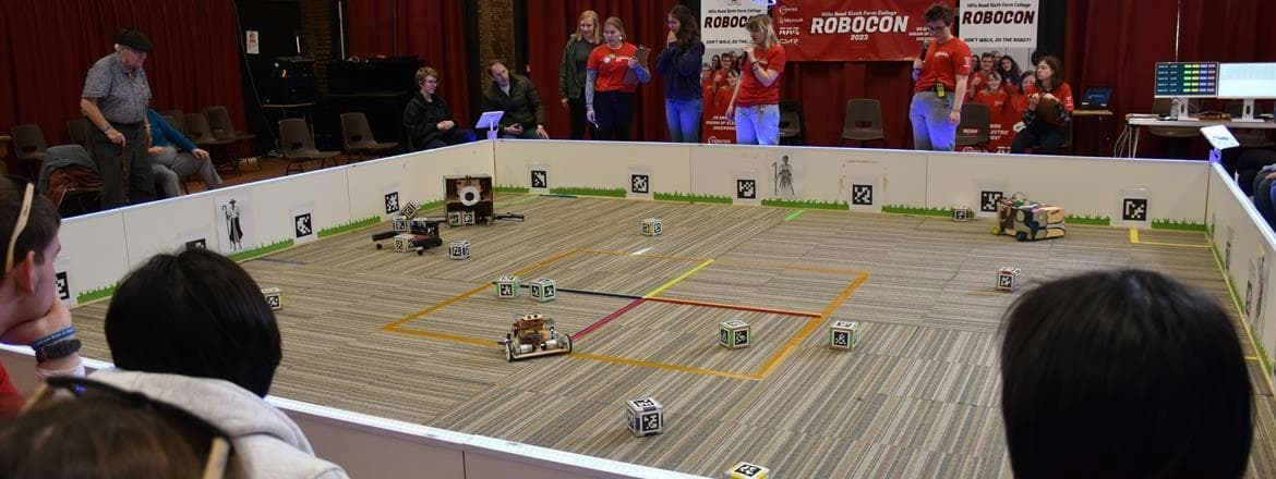 RoboCon is a free, student-led, and fully accessible robotics competition aimed at GCSE students run by the Robotics Society at Hills Road Sixth Form College. By providing a kit containing all the equipment necessary to build a simple robot, our students encourage robotics enthusiasts from local schools to create their own robot as simple or complex as they would like. Support is available from Hills students throughout the build-up to the tournament, and the event itself is a robotacular droidfest of mecha-magnitude.