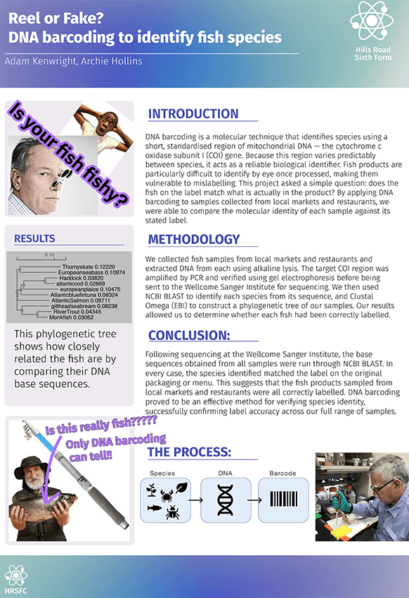 Students presented their findings in a poster format, similar to that used by early career scientists, to address the key question: 'Is fish fishy?', and to work out whether samples are correctly labelled by species, or whether, as other studies have revealed with meat products, could there be mislabelling within the supply chain.